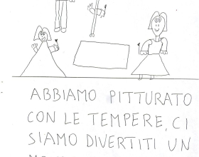 Giungiamo presso una classe dove c'era un armadietto contenente un po' di lavoretti di bambini come anch'io facevo spesso coi miei scolari, ammucchiati uno sull'altro, ne prendo uno a caso, lo apro, era colmo di disegni e scritti di scolari su argomenti oggetto di studio, ricerca o invenzione di fantasia, era proprio ciò che io concretizzavo costantemente coi miei alunni.